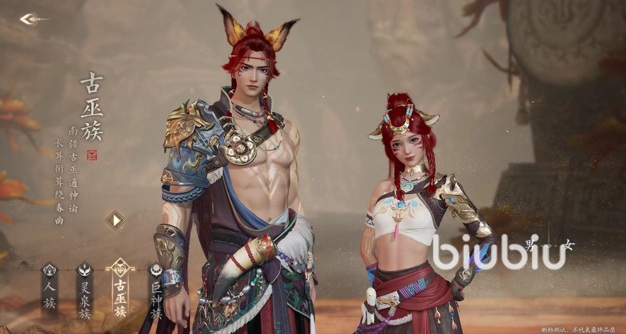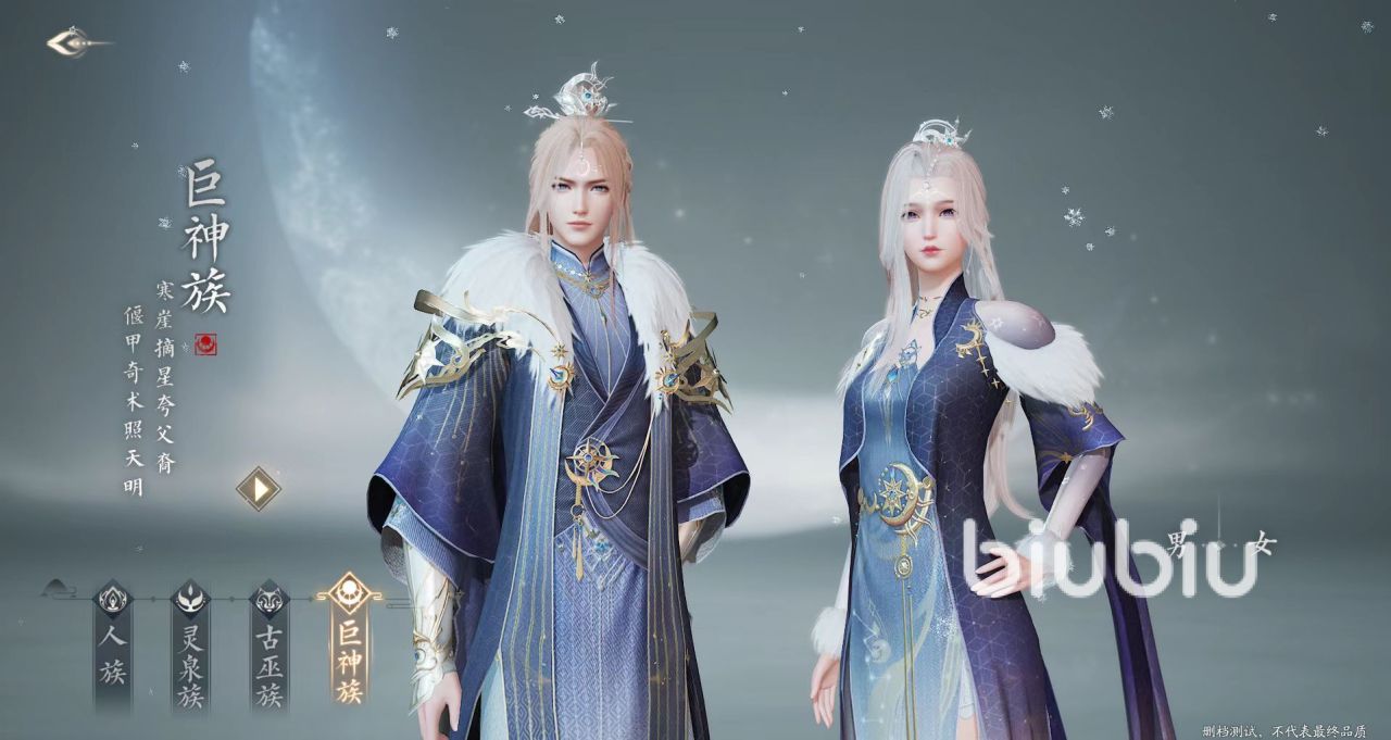 古巫族属于上古魔神蚩尤的后裔,外观方面拥有兽的特征,例如兽耳和长尾等,身材普遍矮小且灵活。在服装中也有很多皮毛、兽角等装饰品,还有神秘图腾元素,他们的脸上拥有一些神秘纹路,古巫族拥有独特的变身能力,可以幻化成各种灵兽,在解控时候会出现灵鹿虚影。巨神族是上古大神夸父后裔,身材高挑精通机关,擅长使用占星术,在夜晚能召唤星辰阵法。装扮方面普遍比较华贵雍容,服饰上还有很多星辰元素。