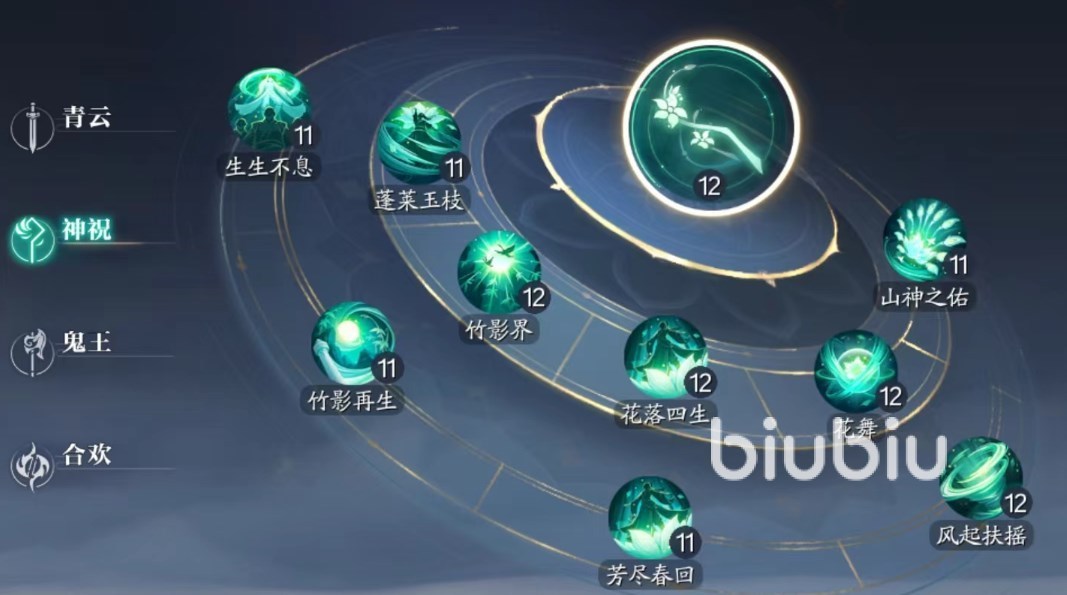 蓬莱玉枝,圆形范围技能,恢复自身和附近所有队友的气血,并在3秒内提供持续性的恢复效果,在持续恢复的时候还能附加15%的减伤增益,并对范围内敌人造成伤害。强化升级后变更为“生生不息”,范围更大,造成的伤害也更高,同样有减伤,但去掉了持续回血效果。可以看得出神祝的技能大多是以提供治疗、控制、保护为主的, 虽然有伤害技,但更多是附带的。