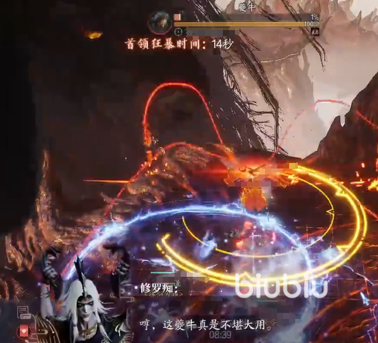 黑洞之后,就会随机掉落陨石在平台的不同位置。此时,队伍中的神助角色就得准确操作画卷,将所有陨石引导至夔牛身上,才能减轻团队压力。牛头下探瞬间,是输出的黄金时机,全体成员需集中火力,迅速将其血量压制至70%,即可顺利进入第三阶段。