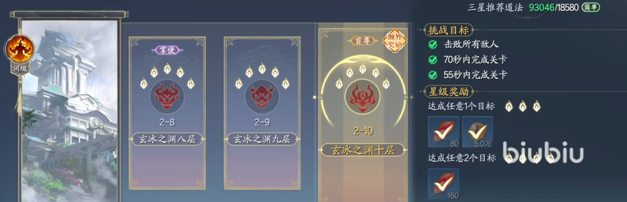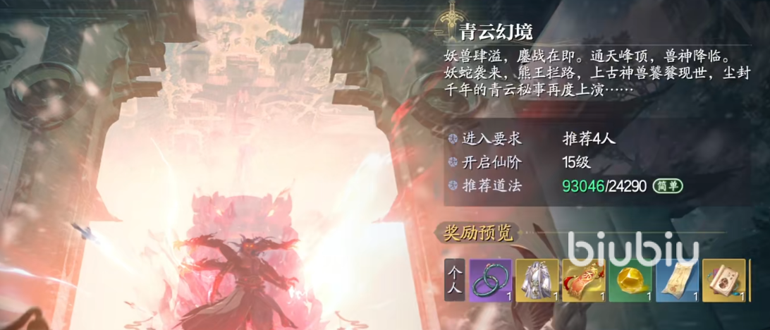 则可找一个朋友或者师傅一起共同面临难关,然后只需15级即可开启。这时道法数值推荐24290左右,就可以稳稳地通关了。这也是第一道筛选,过高后可领取大量奖励以及极品套装,令人喜不胜收。