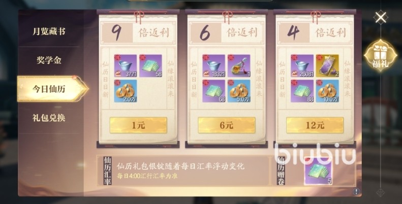 3、今日仙历。这部分也是通过充值获得各类银币,不过相较于【月览藏书】获得的道具需要兑换,这里获得的道具能直接在交易系统中使用。这里有1元、6元、12元3个档次。