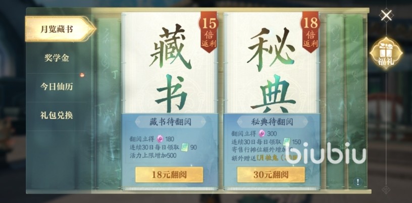 2、月览藏书。这里通过充值获得的是商城货币道具,分为了18元档和30元档,30元档还会额外赠送【月桂兔】;