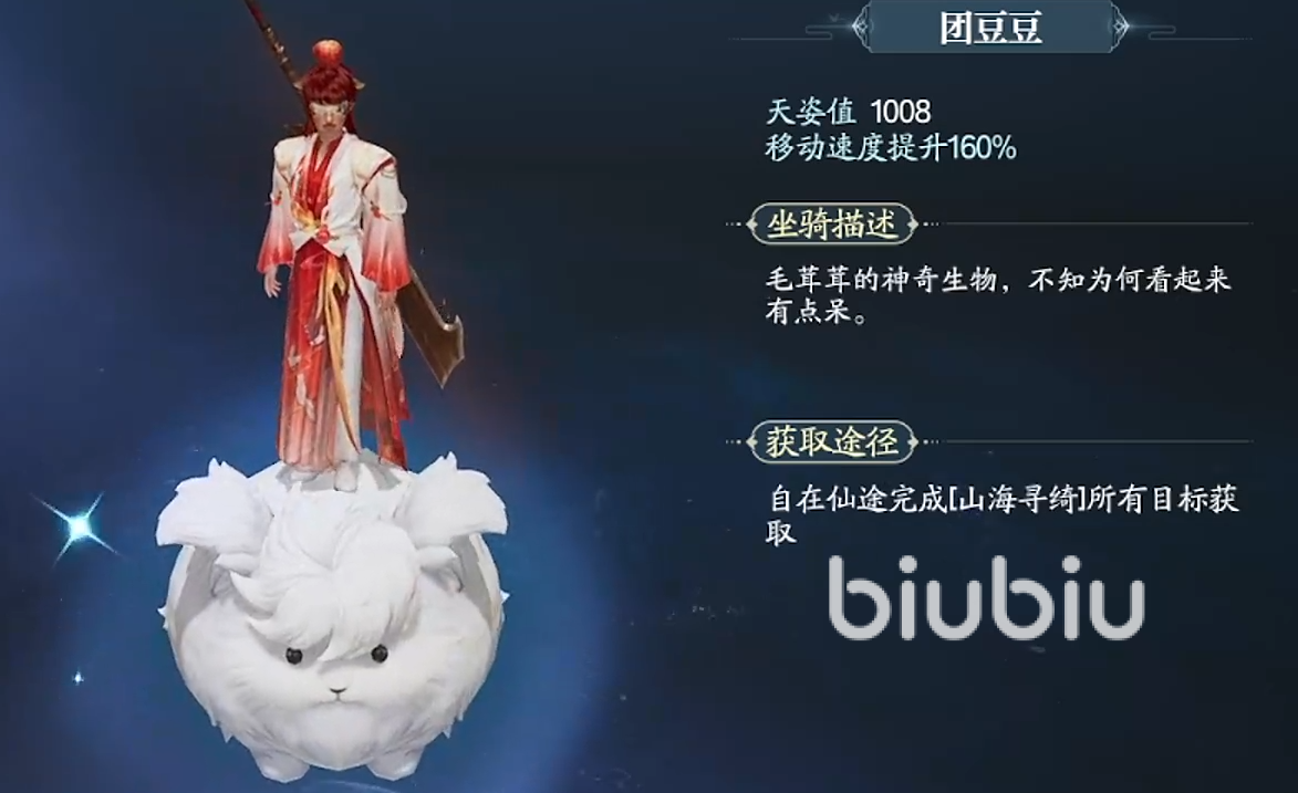 它拥有1008的天资值,能提升160%的移动速度,是一种毛茸茸看起来有点呆的神奇生物,大家可以通过完成“山海寻绮”所有目标来获取。