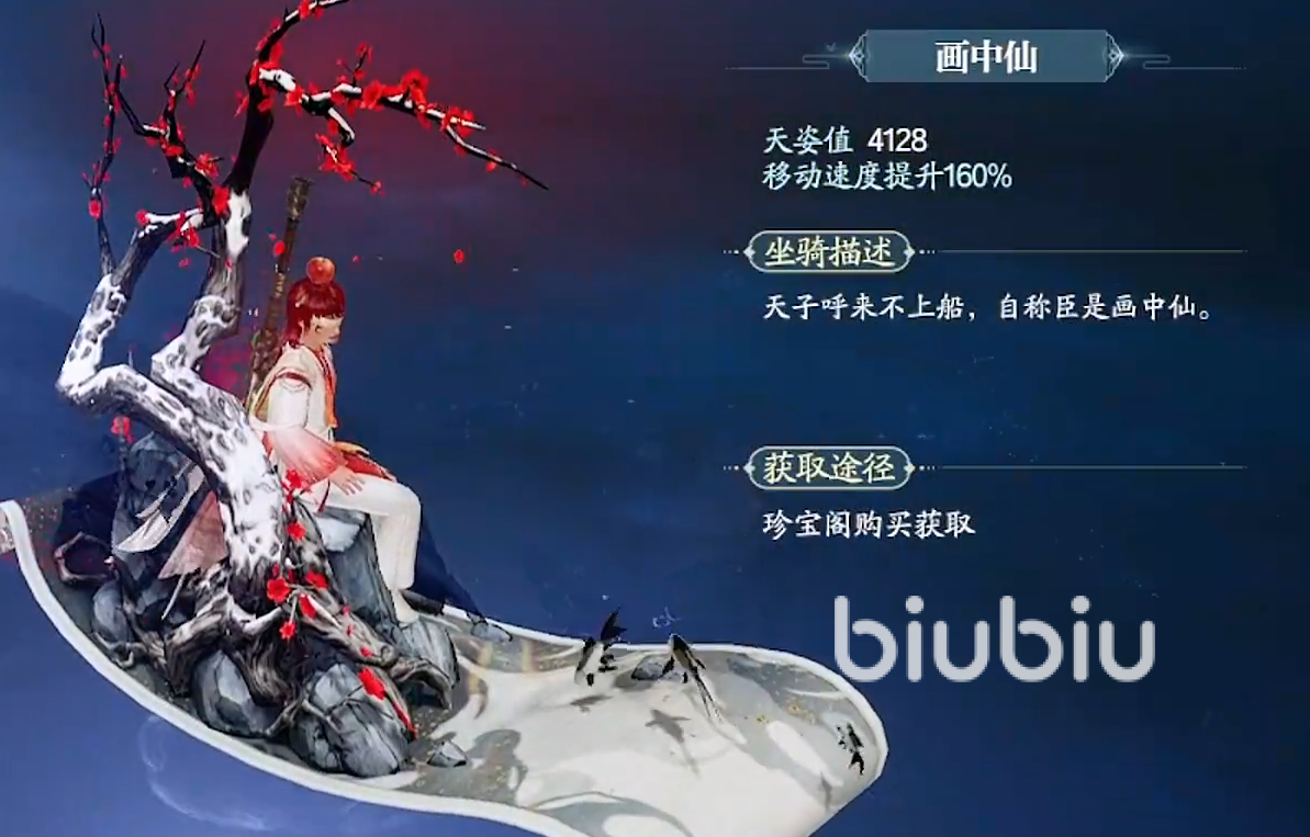 拥有4128的天资值移动速度提升160%,外表是一幅能漂浮并且立体的画卷,可以通过珍宝阁购买获得。