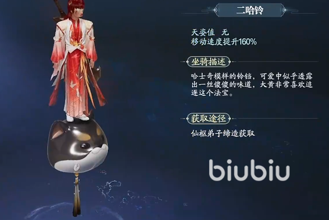 像是哈士奇模样的铃铛,可爱中透露出一丝傻傻的味道,大黄非常喜欢追逐它,二哈铃没有天资值能提升160%移速,获取渠道为仙枢弟子缔造。