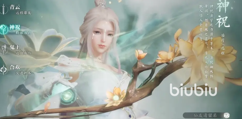 神祝大家可以理解为奶妈,他的“花落四生”能持续治疗目标队友,“蓬莱玉枝”能进行群体治疗,并且还会附带上减伤和强化效果,整体来看是团队最为不可获取的辅助,打团队副本不可缺少,适合喜欢辅助的玩家。