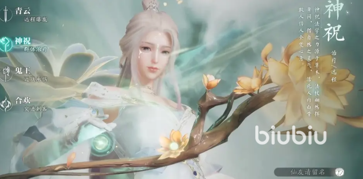 神祝是辅助类的,能靠着强大的治疗辅助能力来提升队友们的续航,使得队伍更加具有生存力,他的普攻会对敌人造成仙法伤害,每3次普攻会增加输出并回复灵力值,他的“花舞”能对周围敌人造成仙法输出并将他们给击飞,他的“花落”会给一位队友回复气血,并自动让范围内生命值最低的队友也得到回复,他的“竹影界”会展开一个向前方移动的竹墙,竹墙在不断移动的情况下会将对手直接撞飞,在墙体存在期间能帮助抵达敌人与飞行物,他的蓬莱在自身有60灵力值的情况下才能使用,释放时会解除掉身上的控制,并复活范围内所有重伤队友帮助他们回复气血。