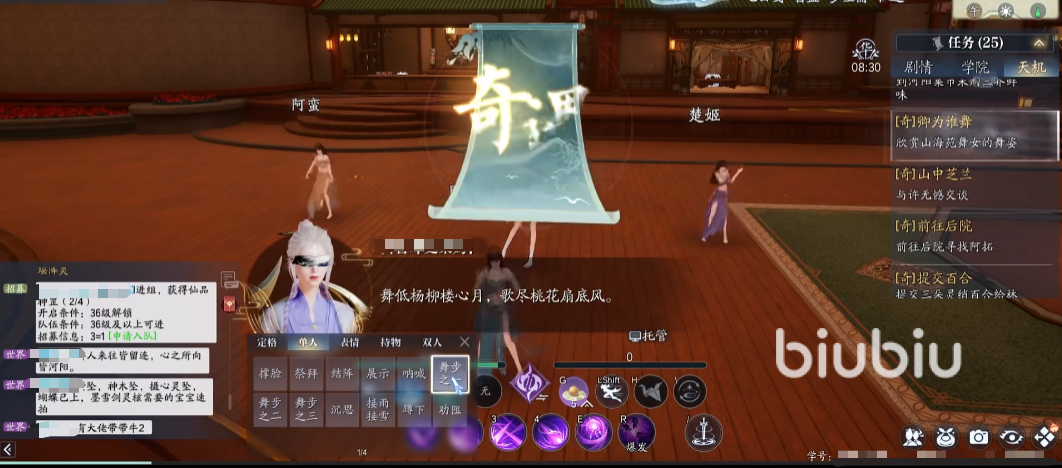 奇遇4“长袖善舞”,一直往前飞,走到玉清殿门口,找到玄阙大人,在他面前跳舞,动作选舞步二。奇遇5“扑流萤”,坐标(17779,19864),往地图右下角的演武场方向去,这个奇遇的主要目的也是拾取道具,到达这个看起来比较简陋的凉亭,在这个垫子上就能捡到。奇遇6“神剑御雷真诀”,还是朝着会武场的方向,来到这个叫“封尘”的NPC面前就能自动触发。奇遇7“月下剑华”,这个奇遇比较简单,是开局的主线中会自动触发的,没有触发的朋友也可以根据点位(18842,18545)。