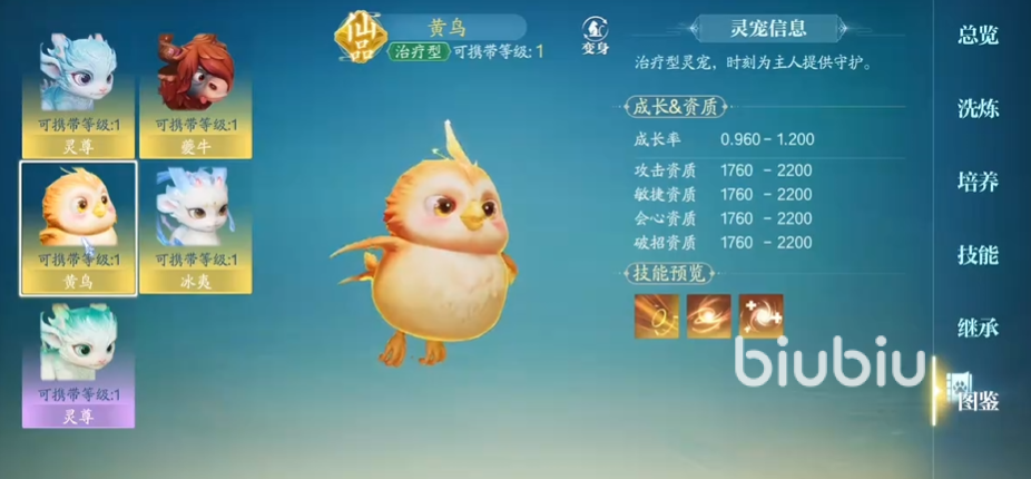 黄鸟也是很多小伙伴会选择的宠物,它的核心技能能够提升10%的防御冷却时间只有15秒,虽然黄鸟和灵尊都是辅助类型的宠物,但其实黄鸟的搭配率会更高一点,适合多个职业使用,因为无论是哪个职业,多点防御力总是好的,所以如果前期小伙伴们不是很熟练的时候,建议搭配这个宠物,给自己的战斗提升容错率。