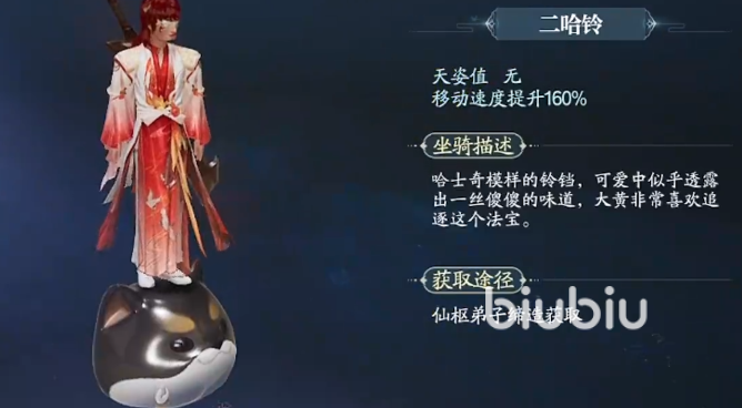 二哈铃是哈士奇形状的铃铛,外表可爱但却透露出一丝丝傻傻的味道,大黄会非常喜欢追逐该法宝类坐骑,想要的可以通过仙枢弟子缔造。