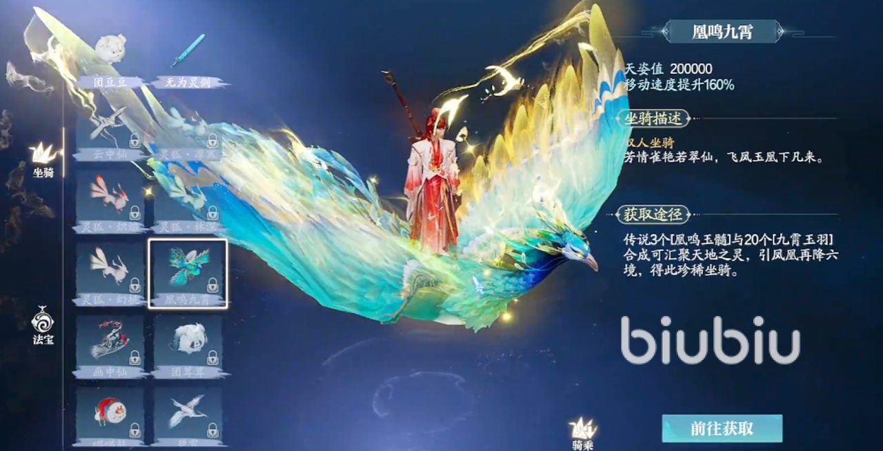 凰鸣九霄加160%移速,天姿值为200000,属于双人坐骑,外表像是凤凰下凡一般,由于是稀有坐骑,想要获取需要3个凰鸣玉髓,以及20个九霄玉羽进行合成。