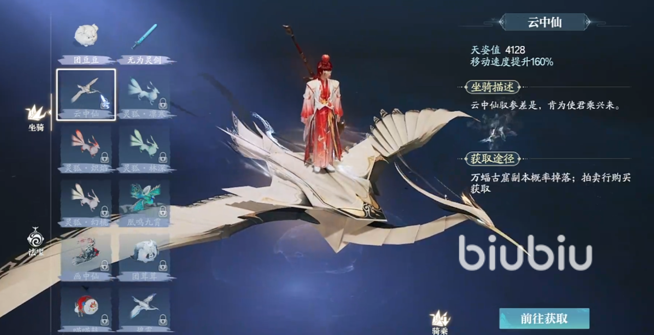 云中仙能让移动速度提升160%,天资值为4128,它的外表像是一只巨大的仙鹤,大家想要可进入万蝠古窟副本中,在这里概率掉落,或者也可以通过拍卖行购买。
