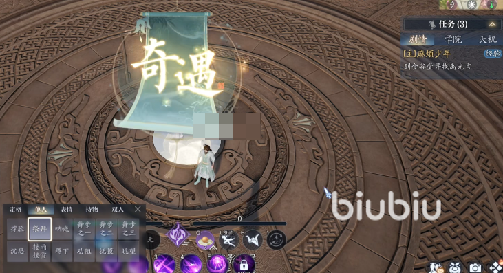 2.尊师重道,在台子的中间,向后转直接飞就可以到,坐标(16539,18360),站在最中间,打开聊天界面,找到祭拜的动作,做一下就能完成这个奇遇。