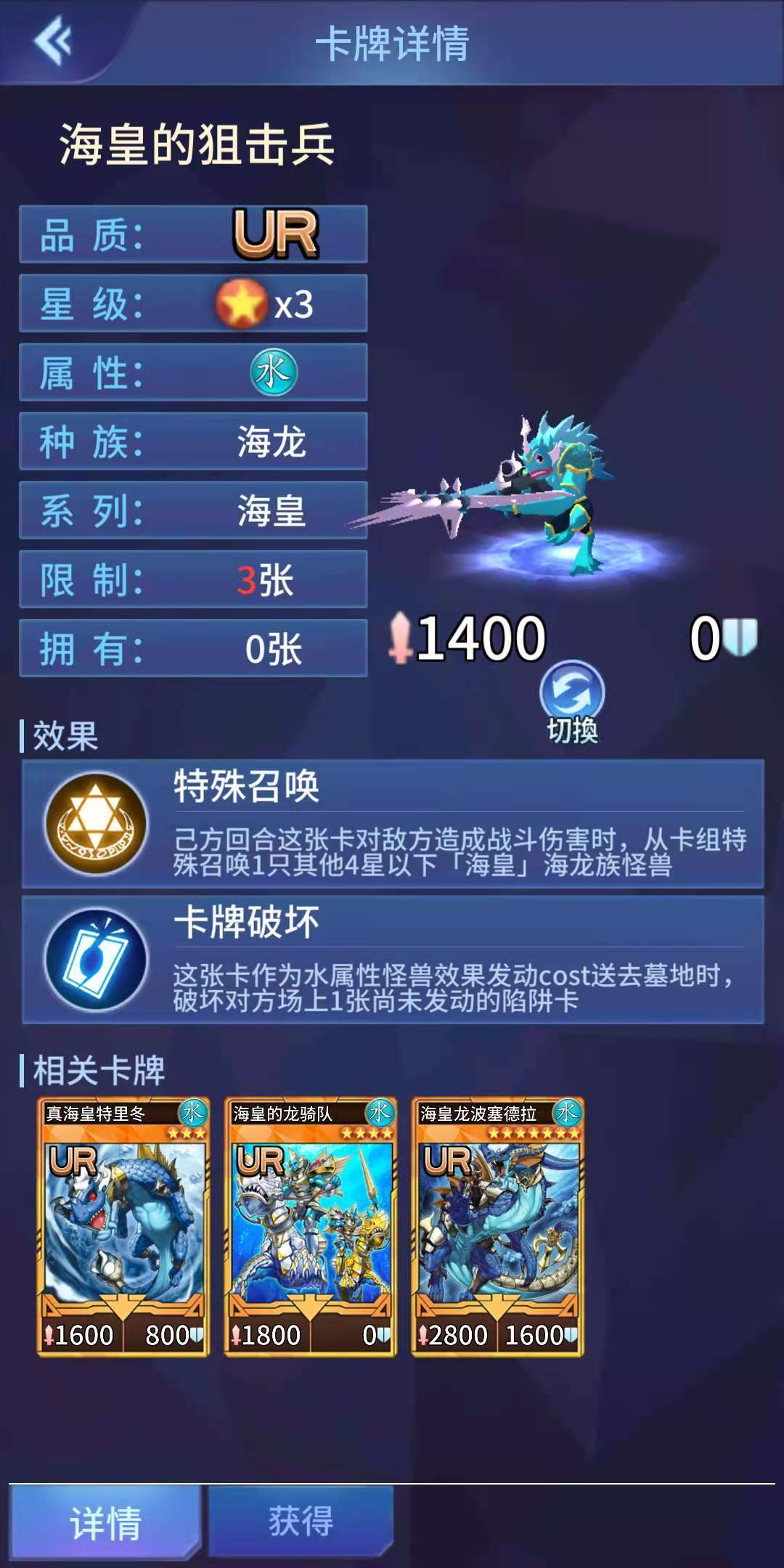 海皇的狙击兵,这是一张能够和海皇的龙骑队打出combo的卡牌。当海皇的狙击兵对敌方造成战斗伤害时,可以将卡组中一直4星及一下名字中带有【海皇】的海龙族怪兽特殊召唤。不过这个效果比较难发动,因为攻击力只有1400点。