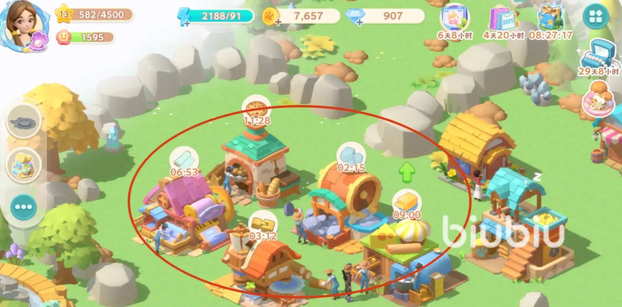 首先开荒第一天效率是很重要的,大家可以先如下图所示,先简单改个地形,清理掉垃圾,把生产建筑放在一起,这样能减少时间上的浪费,小镇入口区域为了保持欢迎感,可以加一些具有亲和力的建筑,比方说热带风情休息厅等。