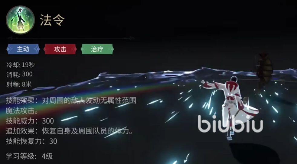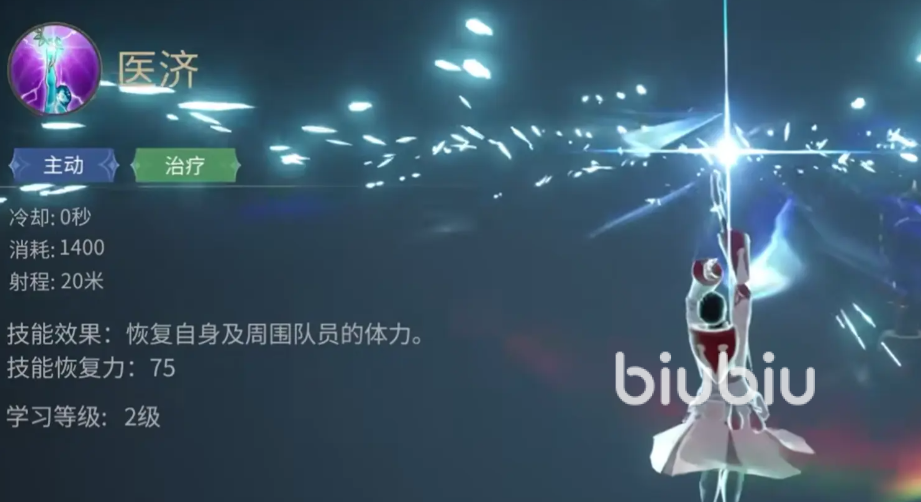 她的“全大赦”能增加自身以及周围队友受到的治疗效果,在团队血量比较危险的时候,配合其他的群疗技有不错的效果,她的“医济”是群体治疗技,能恢复自身以及周围队友的体力。