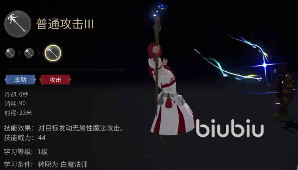 白魔法师的普攻有三段,全程都是单体威力会依次递增,玩家在没有治疗压力或其他攻击技进入冷却时,需要连续点按普攻来保持输出,她的救疗是一个单体的回复技,释放的时候还有概率给队友附加再生让其持续回血,若没有选中目标,会自动对血量最低的玩家使用。