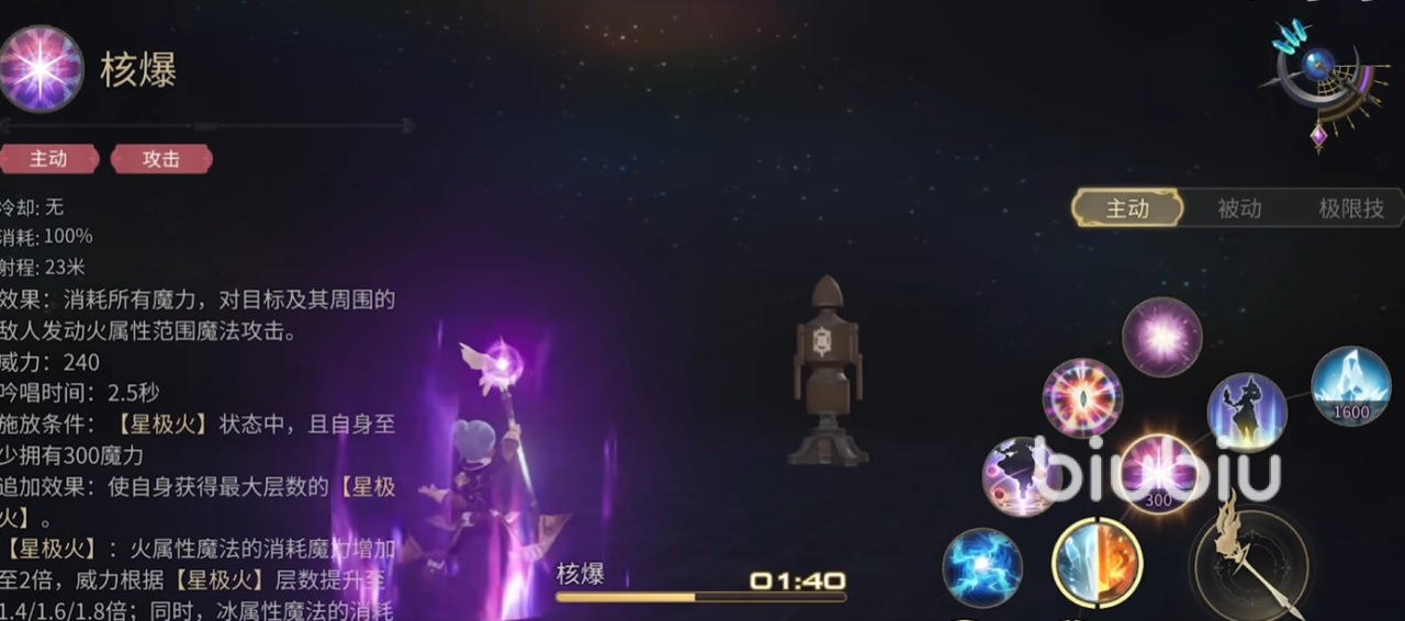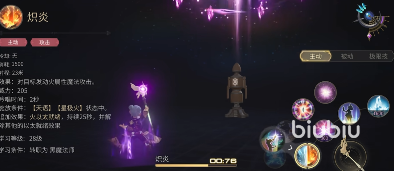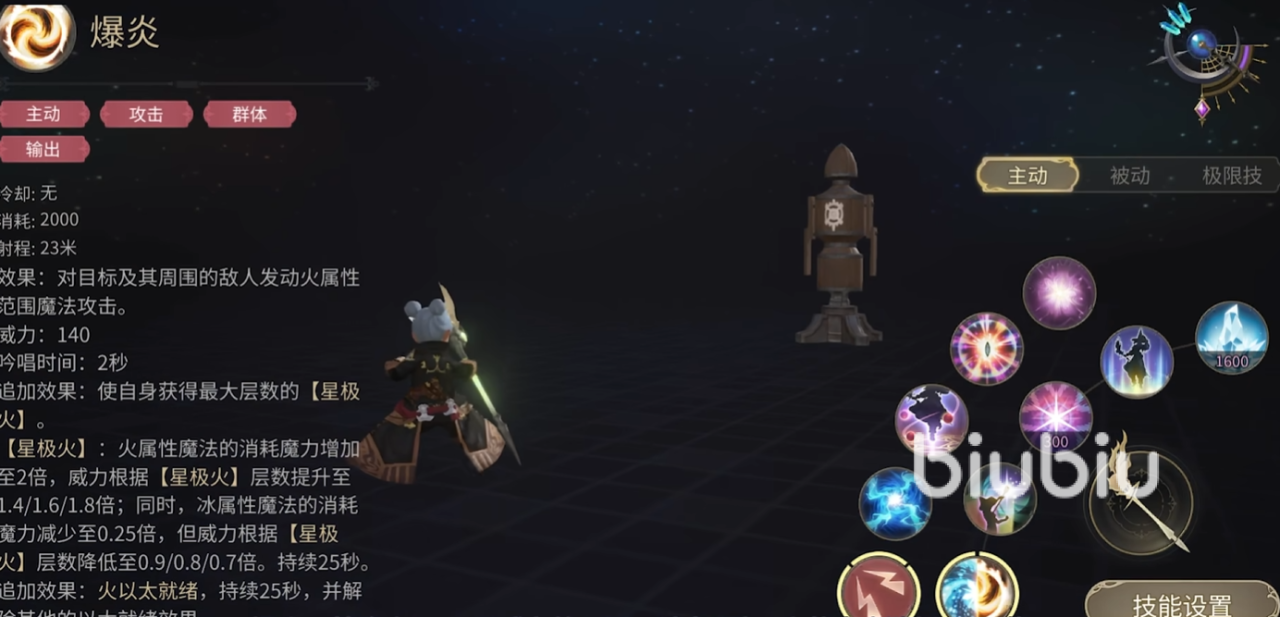 爆炎:对目标及其周围敌人发动火属性范围魔法攻击,并获得最大层数的 “星极火” 效果。“星极火” 下,火属性魔法的消耗魔力增加至 2 倍,但威力提升至 1.4/1.6/1.8 倍,冰属性魔法的消耗魔力减少至 0.25 倍,威力降低至 0.9/0.8/0.7 倍。该技能是黑魔在火属性输出循环中的重要起手技能,开启高伤害的火属性模式。