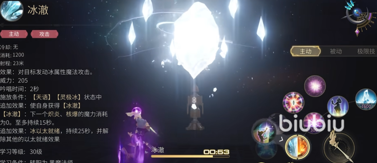 普攻共 3 段,均为单体无属性魔法攻击,是基础的输出手段,在技能衔接的间隙可用于补充伤害。冰封:对目标及其周围敌人发动冰属性范围魔法攻击。同时,使自身获得最大层数的 “灵极冰” 效果。在 “灵极冰” 状态下,魔力恢复速度大幅提升,每 3 秒可恢复 3200/4700/6200 魔力(依技能等级而定),并且火属性魔法的消耗魔力减少至 0.25 倍,不过火魔法威力会降低至 0.9/0.8/0.7 倍。这一技能在需要回复魔力或者准备切换至火属性技能循环前使用,既能造成范围伤害,又能为后续战斗提供增益状态。