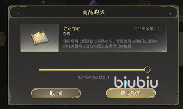 要是大家打算解锁自动寻路的话,第一件事情就是购买寻路卷轴。这时可以点击游戏主页右上角购物袋图标,接着就可以进入商城了。最后在道具分类中找到“寻路卷轴”(售价1元),购买后即可永久解锁自动寻路功能,所以价格颇为诱人。