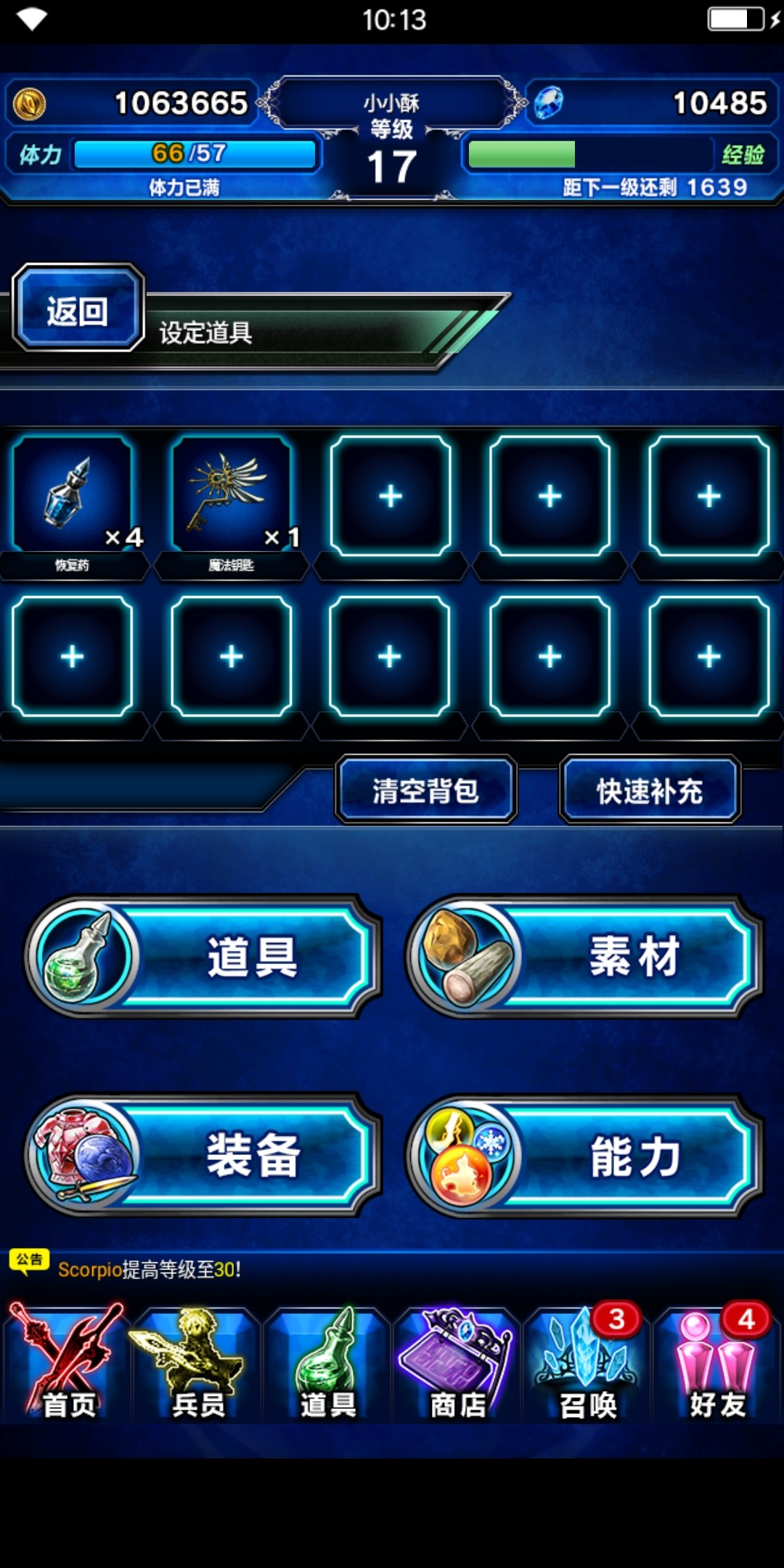 所有玩家的道具栏位共有10个,点击空白道具栏即可挑选战斗道具。战斗道具按照功能分为恢复类、功能类和增益类3种,不同种类的道具有着使用方法。最简单的恢复类道具包括回血药和回蓝药,只需选中特定英雄左滑即可补充生命值或魔法值。