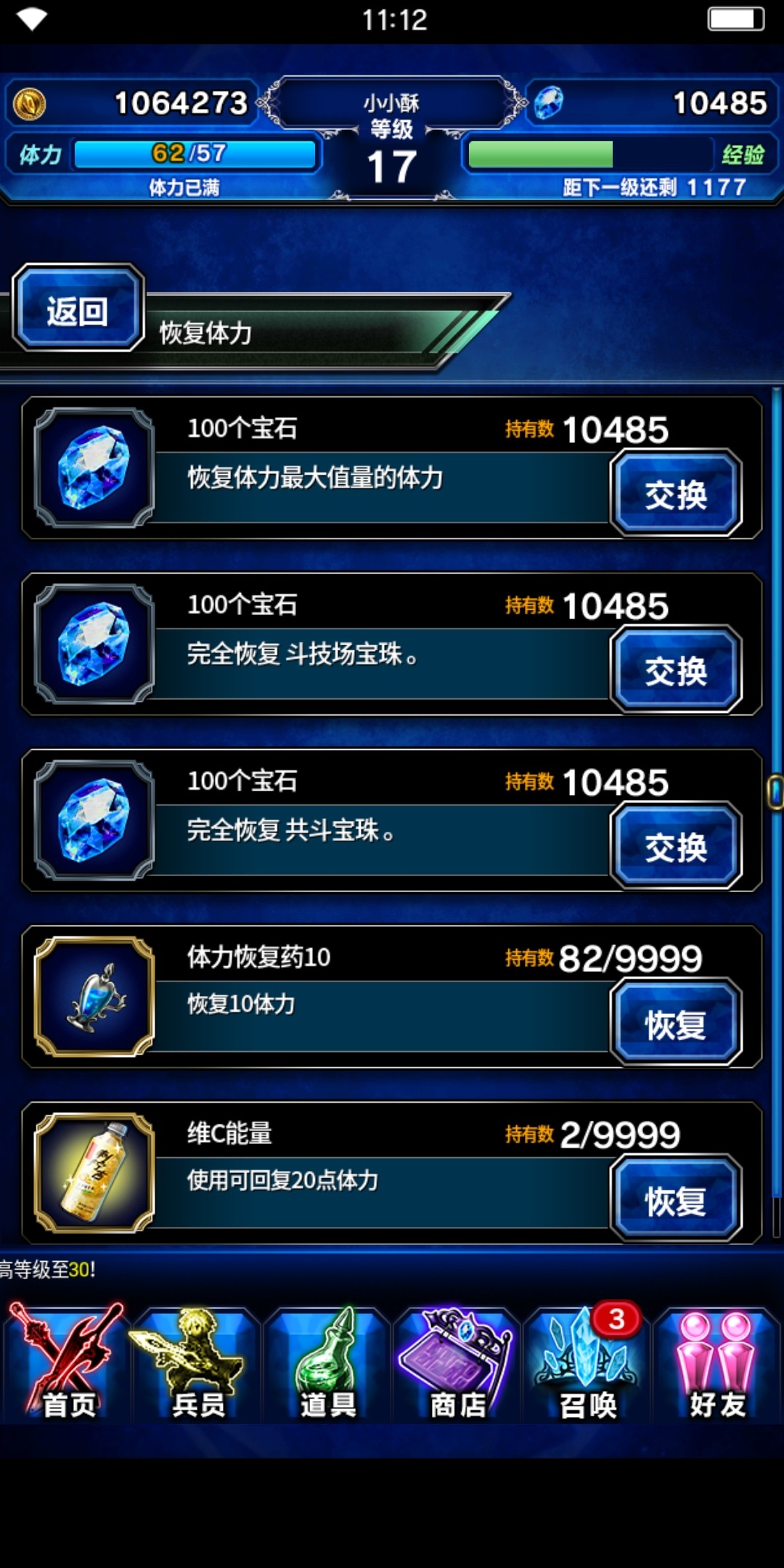 兵员等级的飞速提升非常依赖充足的体力值,玩家除可在升级时获得体力补充外,还可直接使用宝石购买或体力药来恢复体力。注意在玩家临近升级时不要人为恢复体力,这样就能白嫖到升级时的体力补充啦!