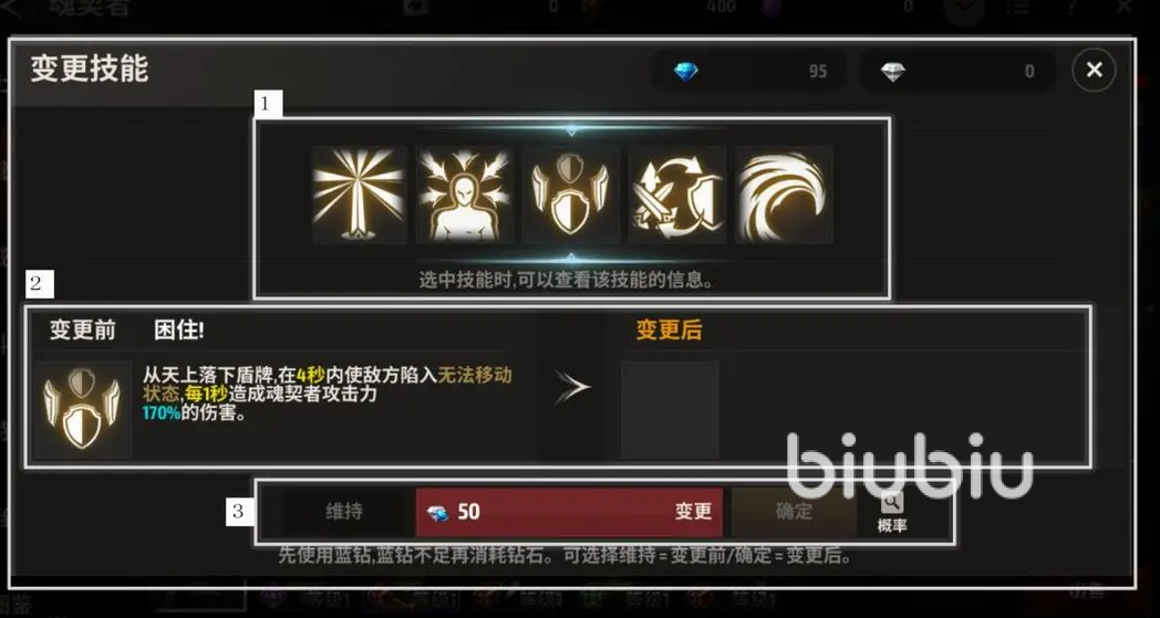 角色技能分为普通技能与终极技能,普通技能可以进行变更、升级,而终极技能是固定技,只能进行升级强化。角色根据其稀有性,有1到5个初始技能,玩家可以选择变更技能。