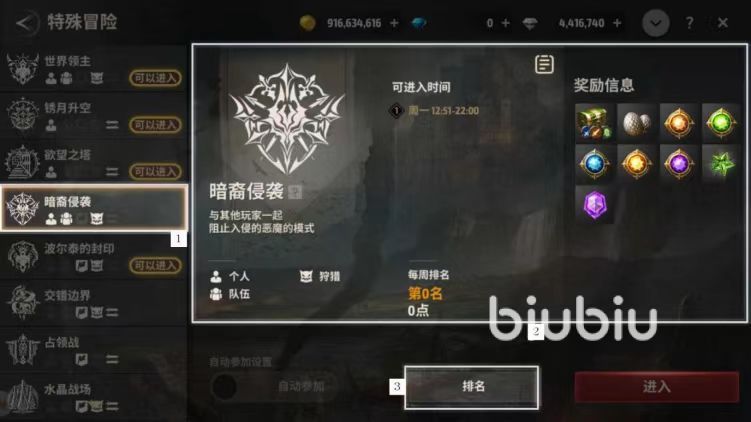 可以在冒险功能中个人页面中点击直接进入,随时能够查看在活动中分数和当前所在排名,如果能够在服务器中任意赛季里进入到前10名,就可以在游戏中获得象征荣誉的铜像,这是很多玩家争相争抢的荣誉,这里7天为一个赛季。为了不错过这项活动,建议开启自动参加设定,这样可以快捷进行确认,自动进入到战场中。