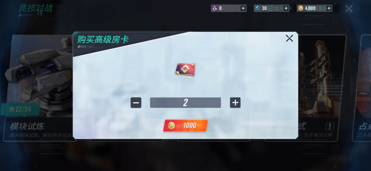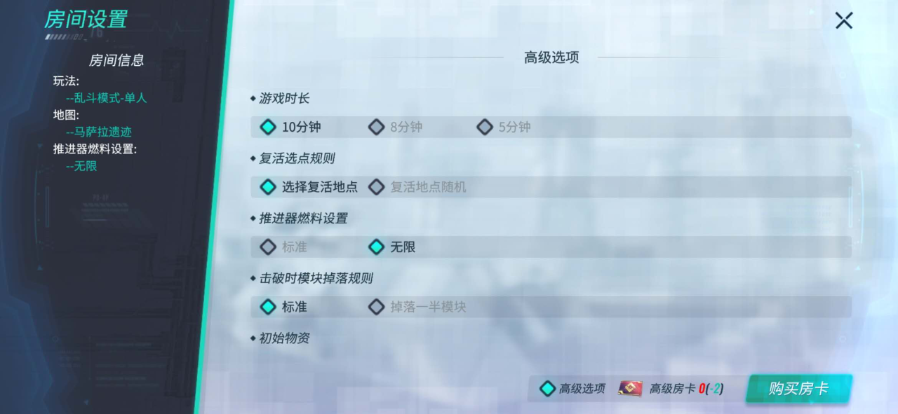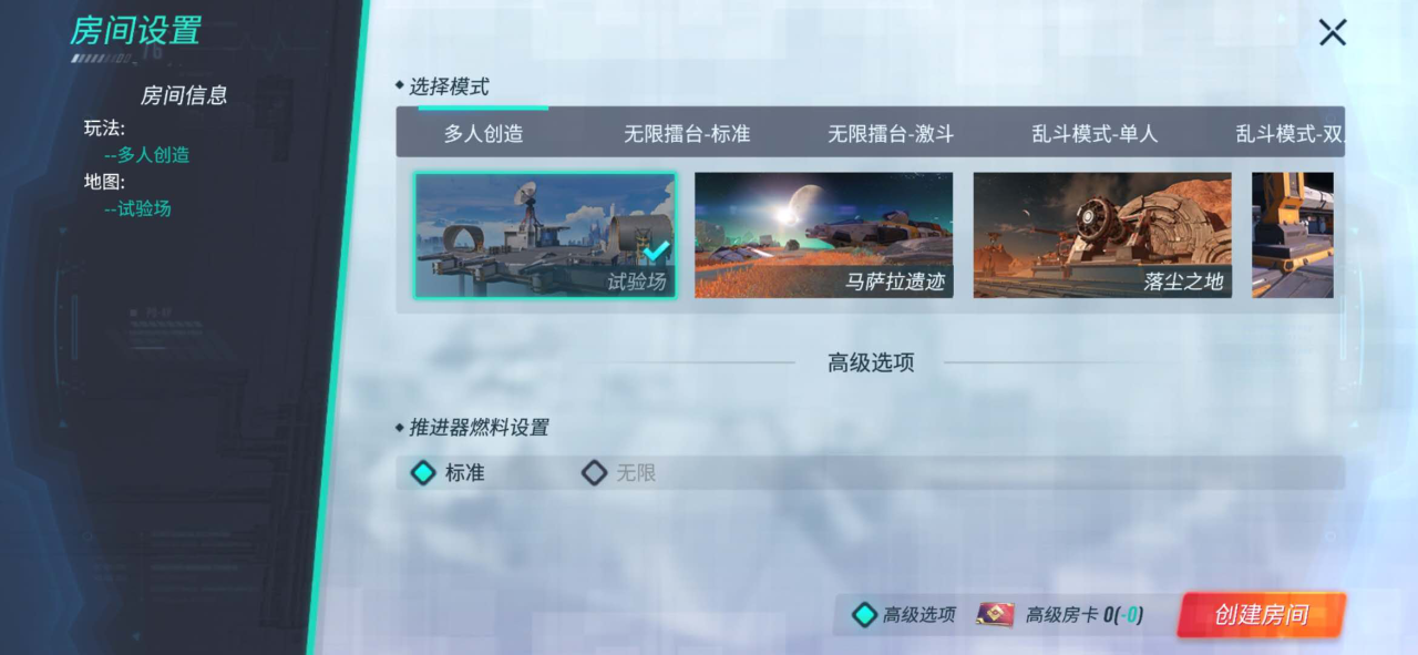 选择了推进器燃料无限后再创建房间需要消耗品三张高级房间卡,高级房间卡可以直接在界面上花费1500金币来购买也可以在其他活动中搜集。金币可以在参加战斗后根据评分来获得,也可以使用消耗晶钻来兑换,小编不建议大家使用金币来兑换高级房间卡,因为金币还是很宝贵的。
