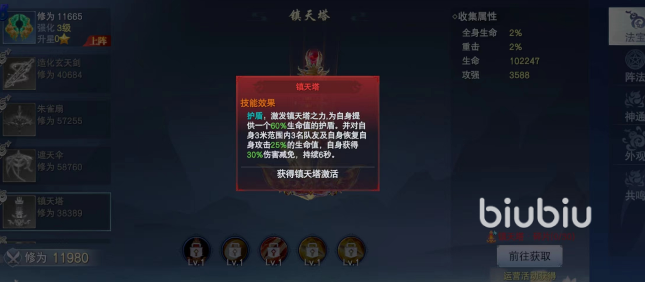 武器技能方面,激发镇妖塔的镇妖之力,为自身提供一定程度的护盾,同时并恢复自身三米范围内三名友方单位,自身攻击力百分之25的生命,且自身会获得一定程度的伤害减免持续六秒。算是上面所说的遮天伞的下位替代,但由于它的基础属性增加的是生命力和攻击,其实效果有的时候比遮天伞要好用。